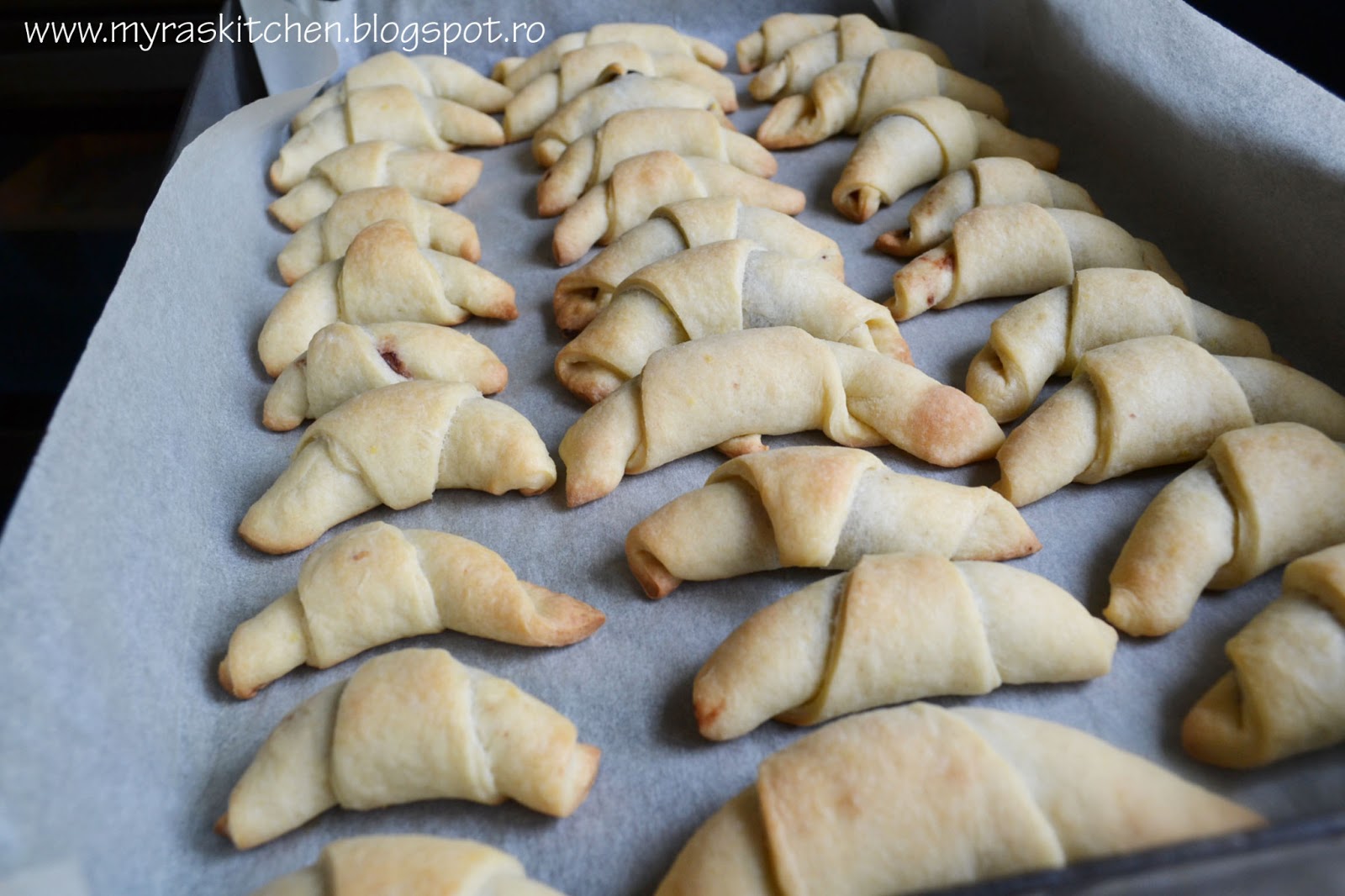 Punem cate putin gem pe marginea fiecarui triunghi si rulam. Ii dam forma unui cornulet si il asezam in tava tapetata cu hartie de copt.